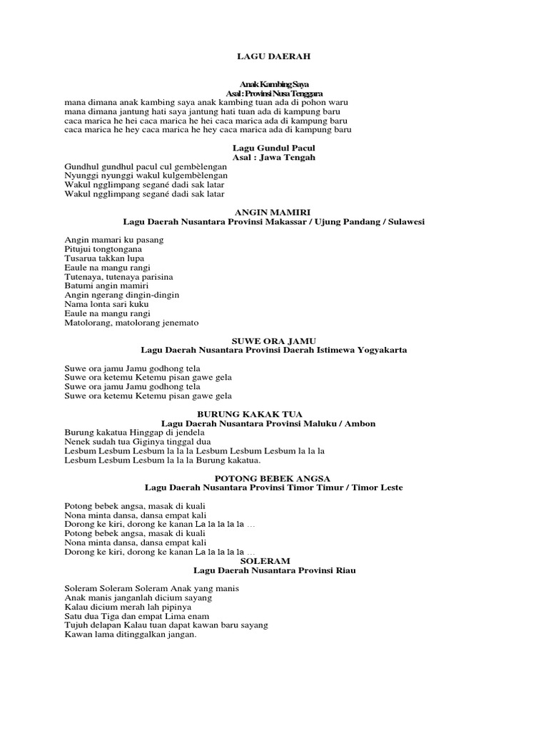 6 Lagu Daerah Nusa Tenggara Timur Yang Terkenal Sering Jalan Potong bebek angsa, masak di kualinona minta dansa, dansa empat kalisorong ke kiri, sorong ke kananlalalalalala lalalalalala kalau jatuh cinta berjuta rasanyakalaulah usaha pedekate namanyakalaulah berhasil jadianlah namanyakalau gagap terus ya.